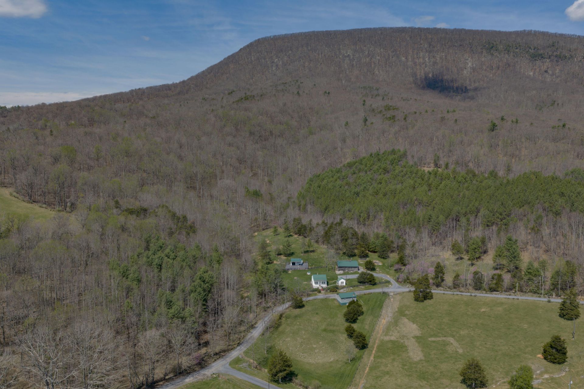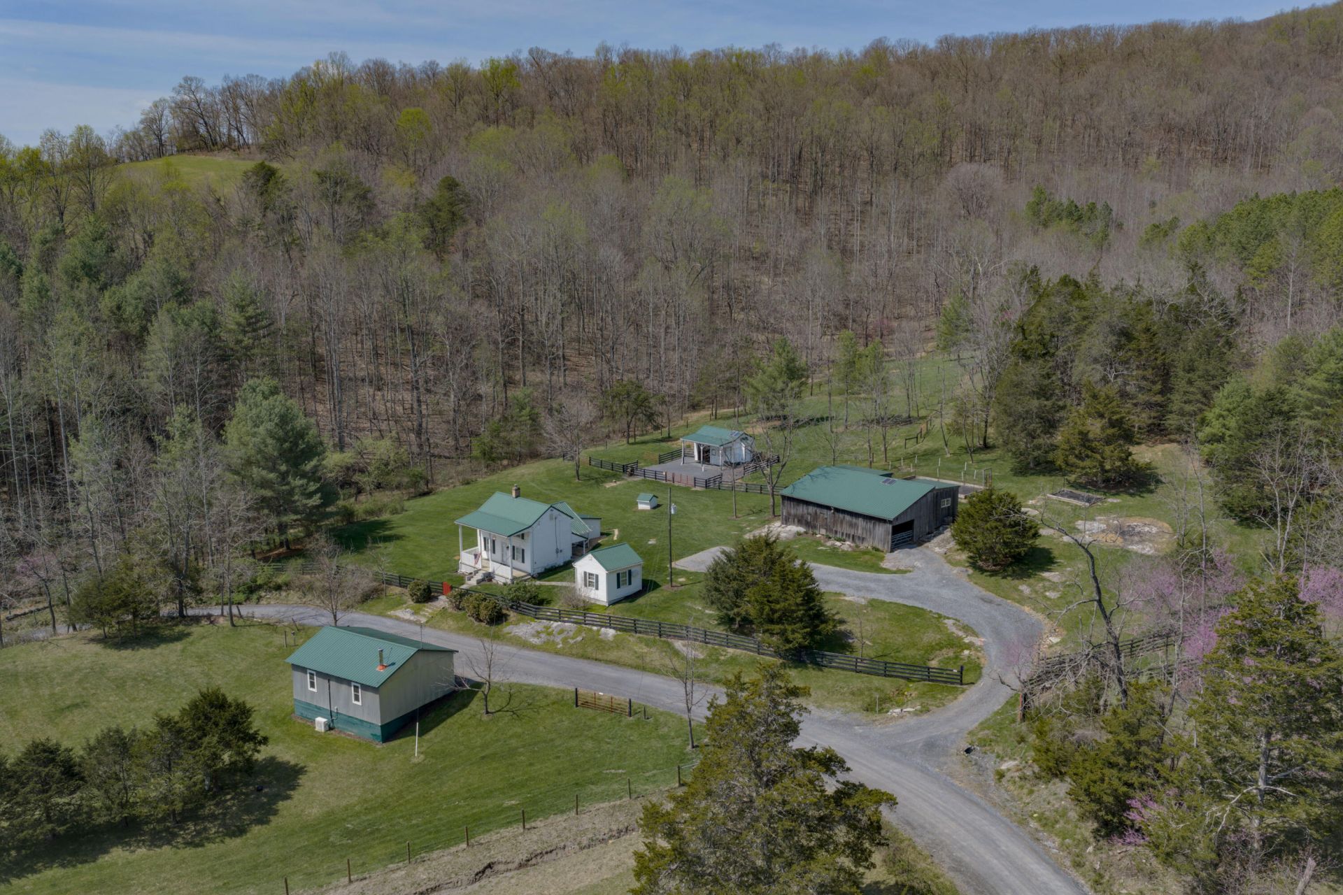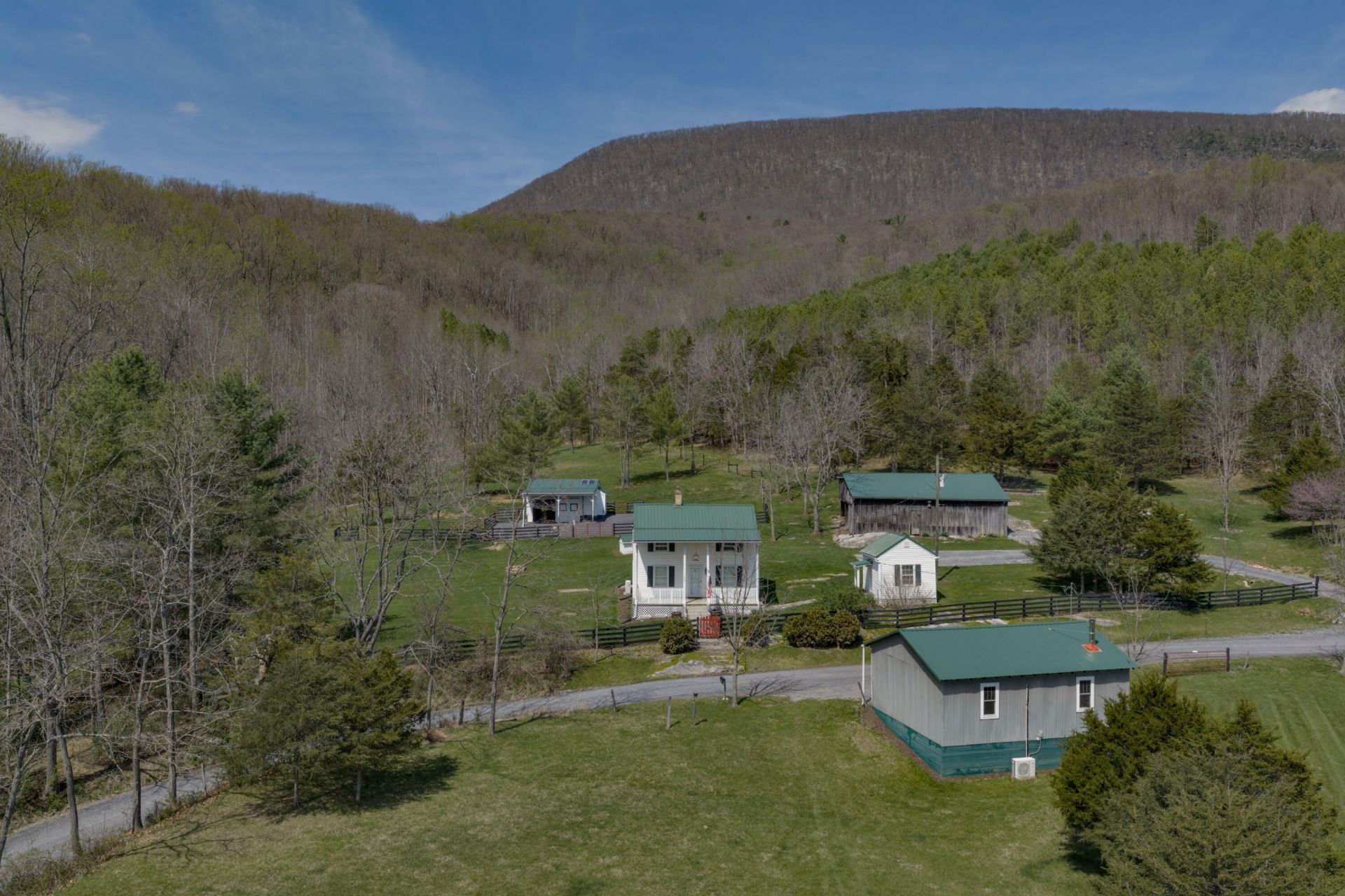 Picturesque small mountain farm tucked away on quiet country road offers a rare blend of historic character, modern updates, and functional farm infrastructure set on 5.348 acres. Originally dating to the 1890s, the home has been thoughtfully renovated with updates to all major systems, including wiring, plumbing, roofing, insulation, and HVAC. Character-defining interior elements provide exceptional charm, including oak and pine floors, walnut inlay surrounding a native stone fireplace with wood stove insert, and exposed ceiling joists showcasing original floorboards and sawn lumber. A beautifully updated kitchen offers high-end amenities with hickory cabinetry, wood countertops, and stainless appliances.